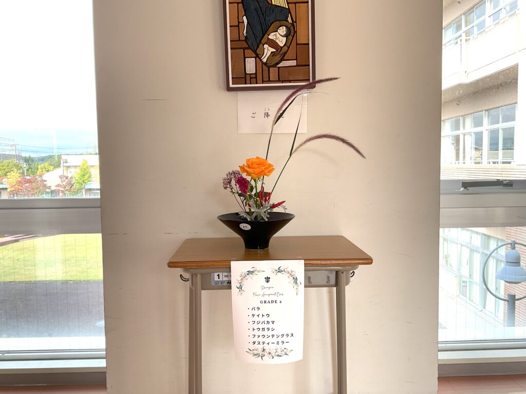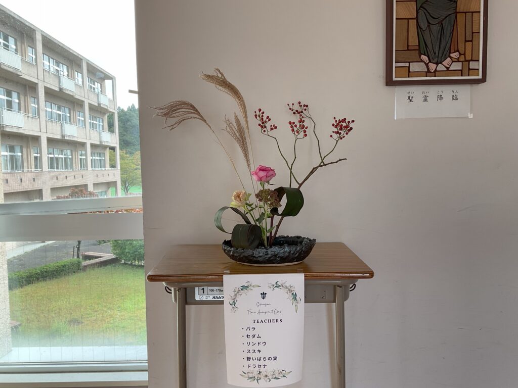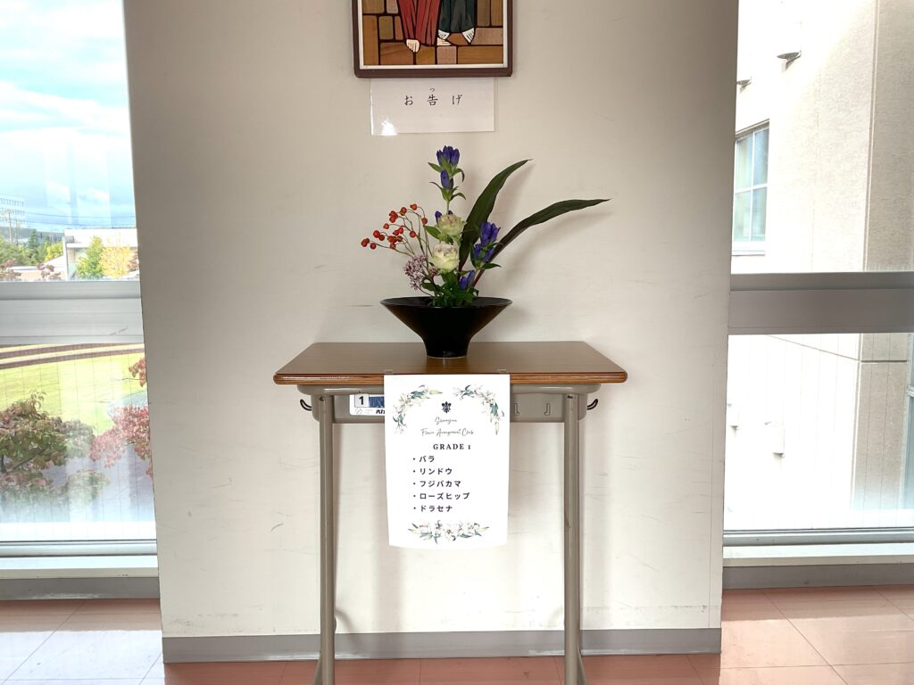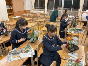秋色の花々が彩る 華道部の生け花時間 投稿日: 2025年10月17日2025年10月17日 投稿者: サイト管理者 華道部では、月に一度の恒例行事として先生をお迎えし、生け花の時間を過ごしました。 今回は、学年ごとに異なる花材を用い、バラ、すすき、野いばらの実、りんどう、フジバカマなど、秋の風情あふれる花々が並びました。 一人ひとりの感性が生かされた作品が完成し、季節の移ろいを感じる穏やかなひとときとなりました。