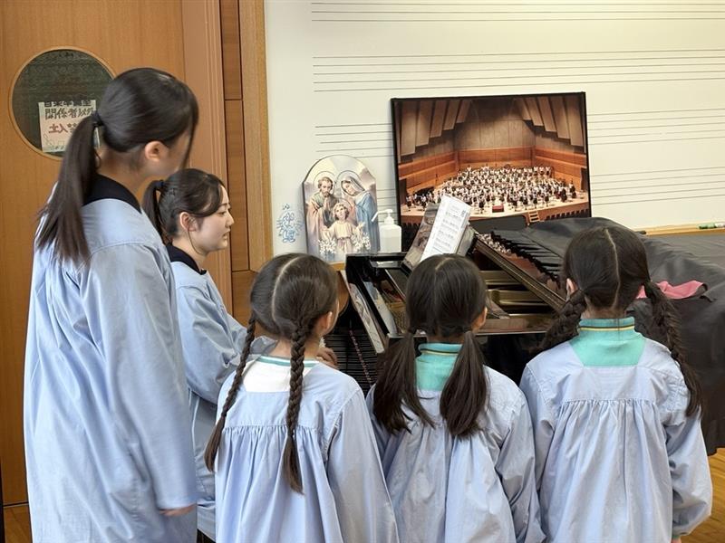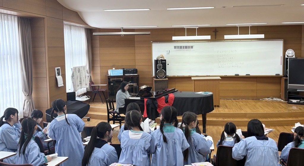 初めは少し緊張していた1年生も、優しくリードしてくれる高校生と一緒に歌ううちに、だんだん笑顔に。かわいらしい歌声が音楽室いっぱいに広がり、あたたかい交流の時間となりました。