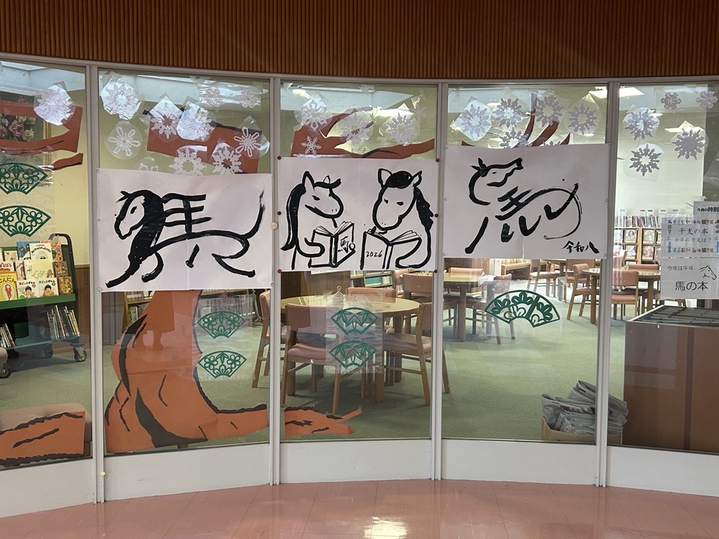 写真は、図書室前の掲示物!躍動感のある🐎ですね。