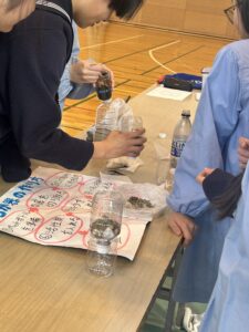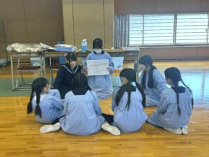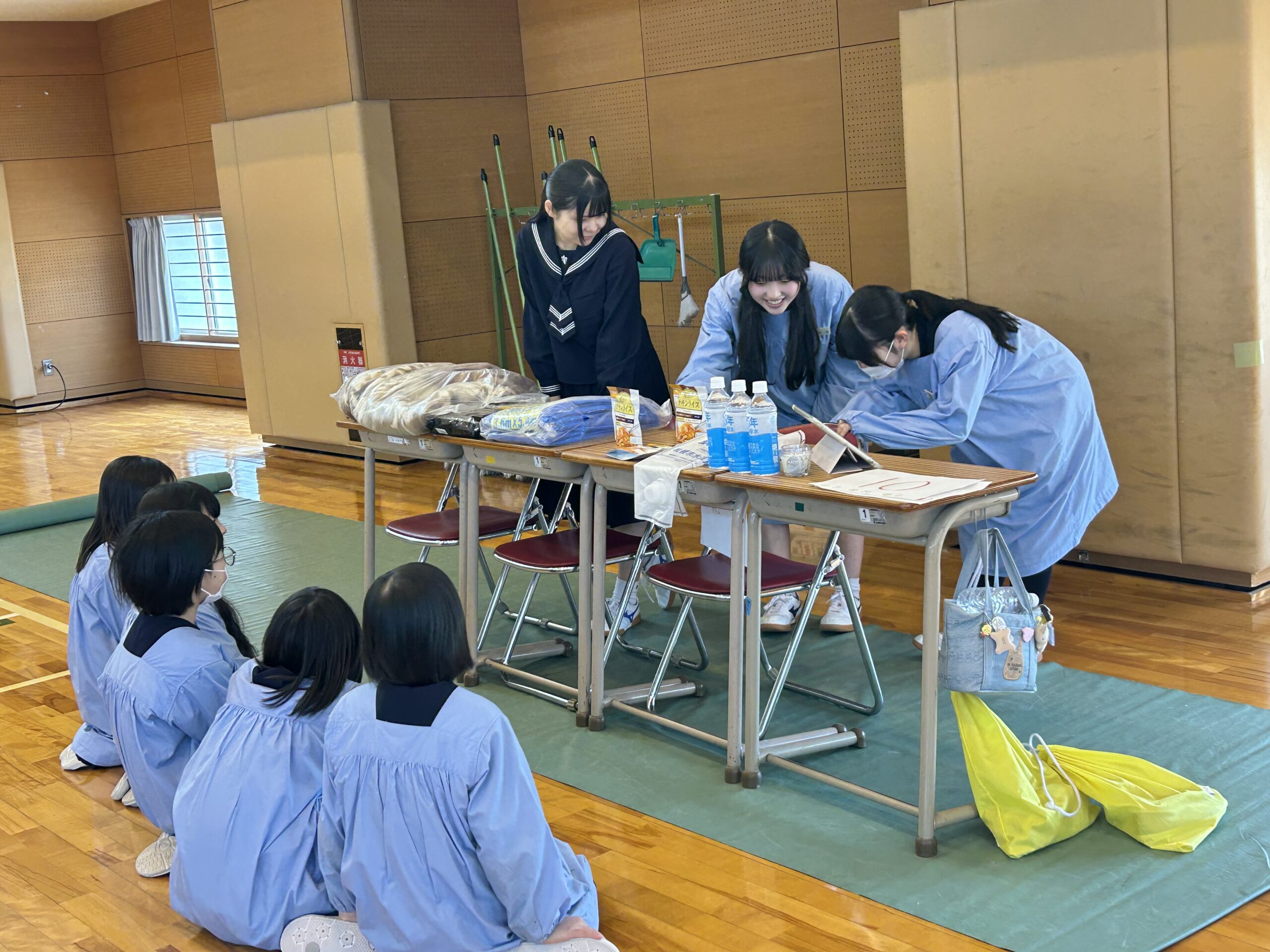 秋の探究発表会で取り組んだ内容を小学生向けに再構成し、体育館で併小4・5年生を対象に15分×3回のワークショップを実施。高校Ⅱ年生にとってはこれまでの学びを整理し直す機会となり、小学生にとっても防災を身近に感じる時間となりました。